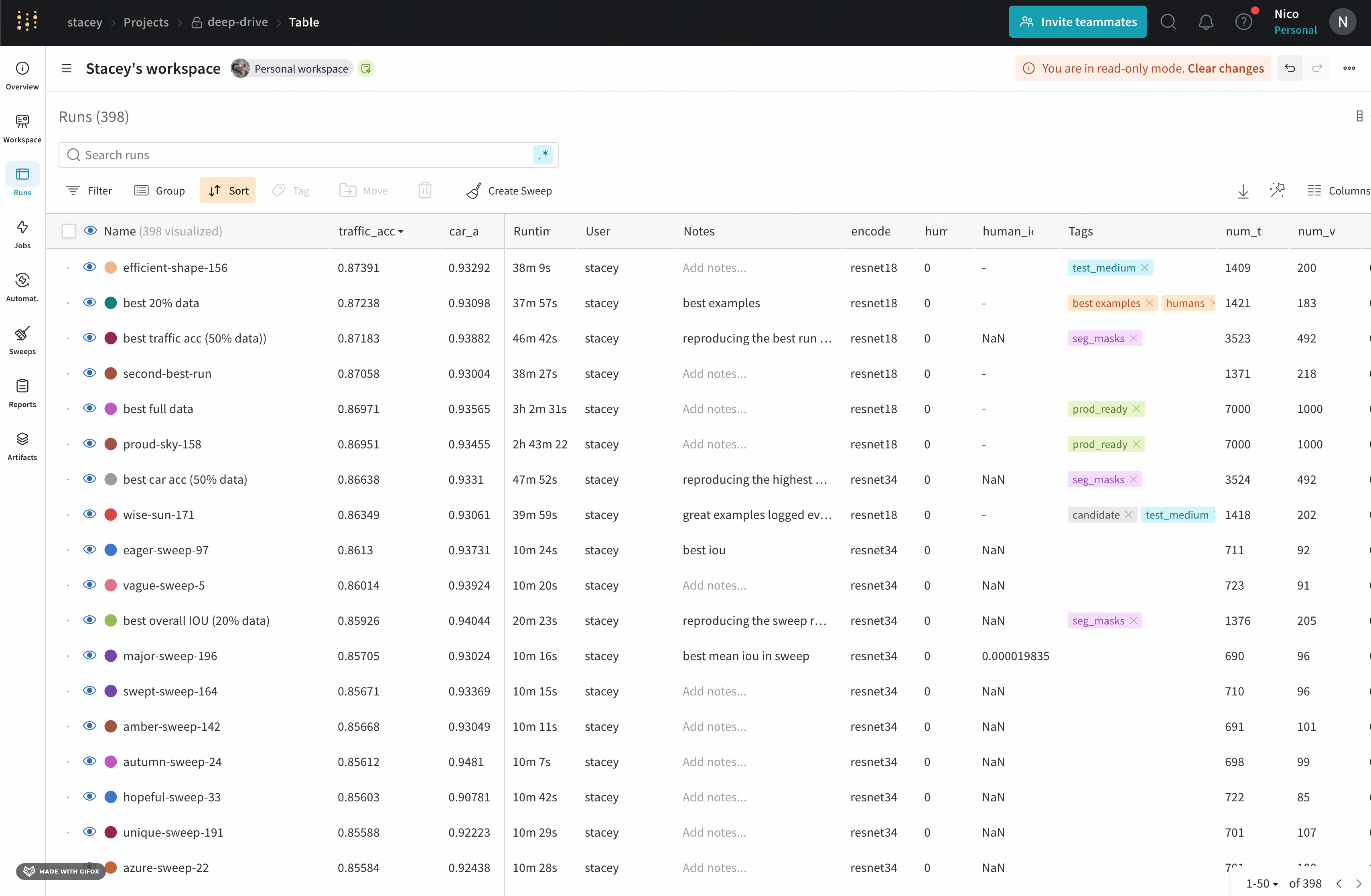 このセクションでは、グループとジョブタイプを使用して run を整理する方法についての手順を紹介します。 run をグループ(たとえば、実験名)に割り当て、ジョブタイプ(たとえば、前処理、トレーニング、評価、デバッグ)を指定することで、ワークフローを簡素化し、モデルの比較を改善できます。Run にグループまたはジョブタイプを割り当てる