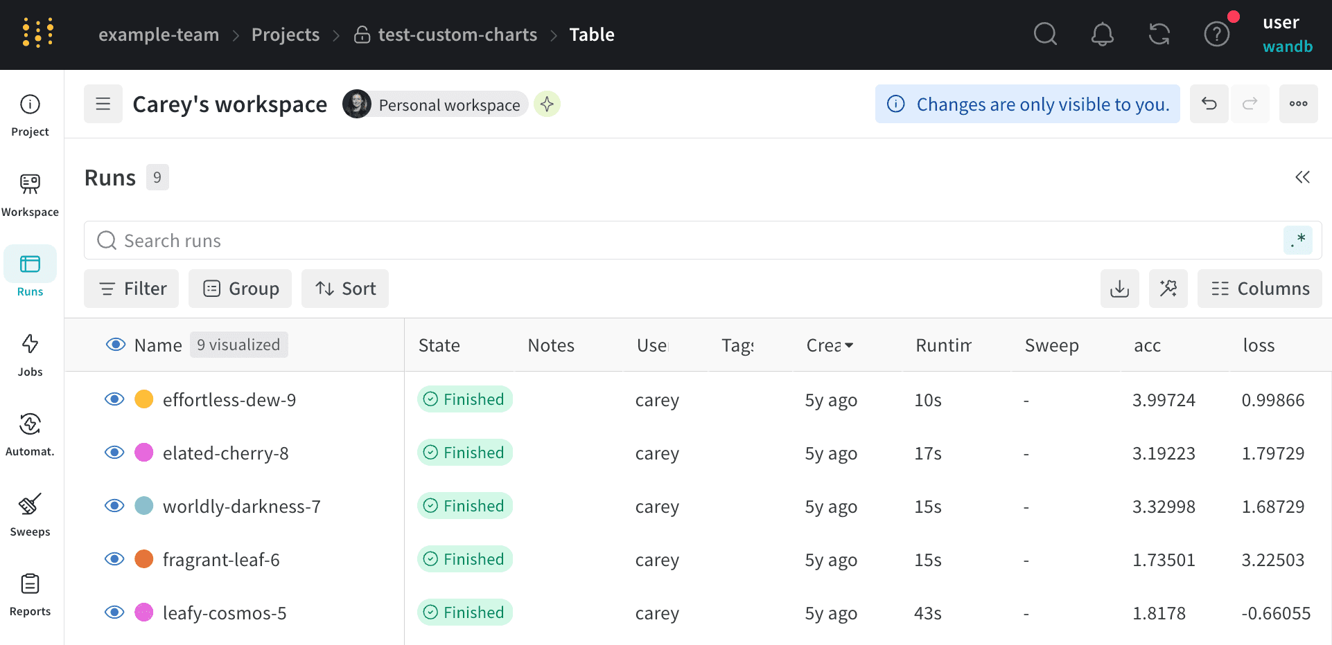 Runs タブには、プロジェクト内の run の詳細が表示されます。デフォルトでは多くの列が表示されます。
