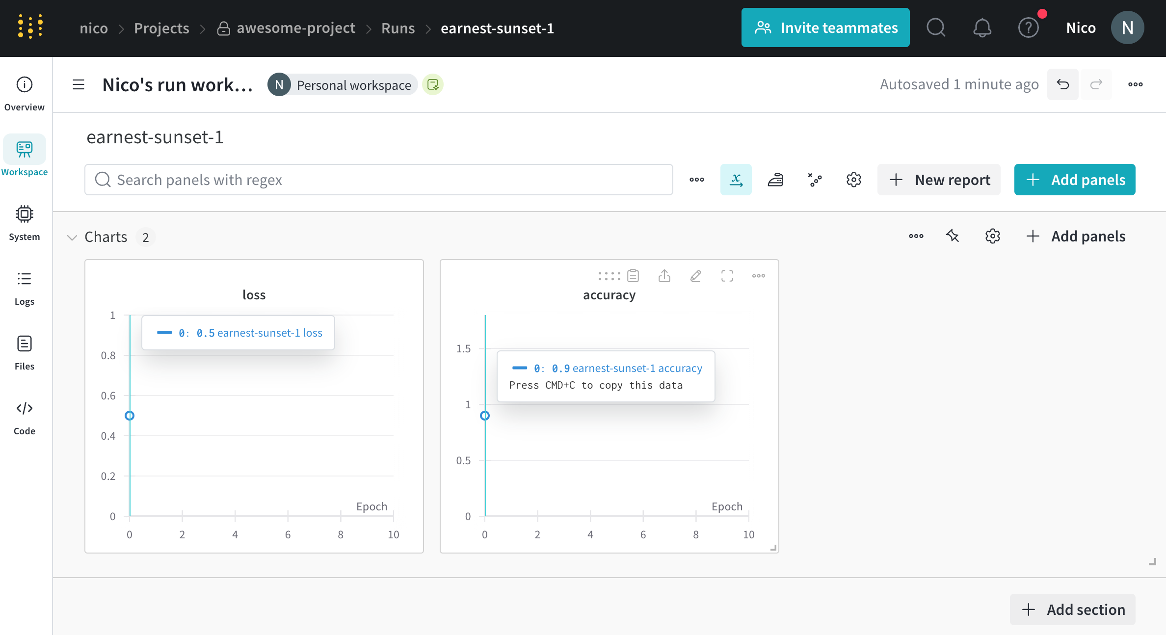 nico は run を記録したエンティティであり、awesome-project は run が記録されるプロジェクトの名前、 exalted-darkness-6 は run の名前、pgbn9y21 は run ID です。