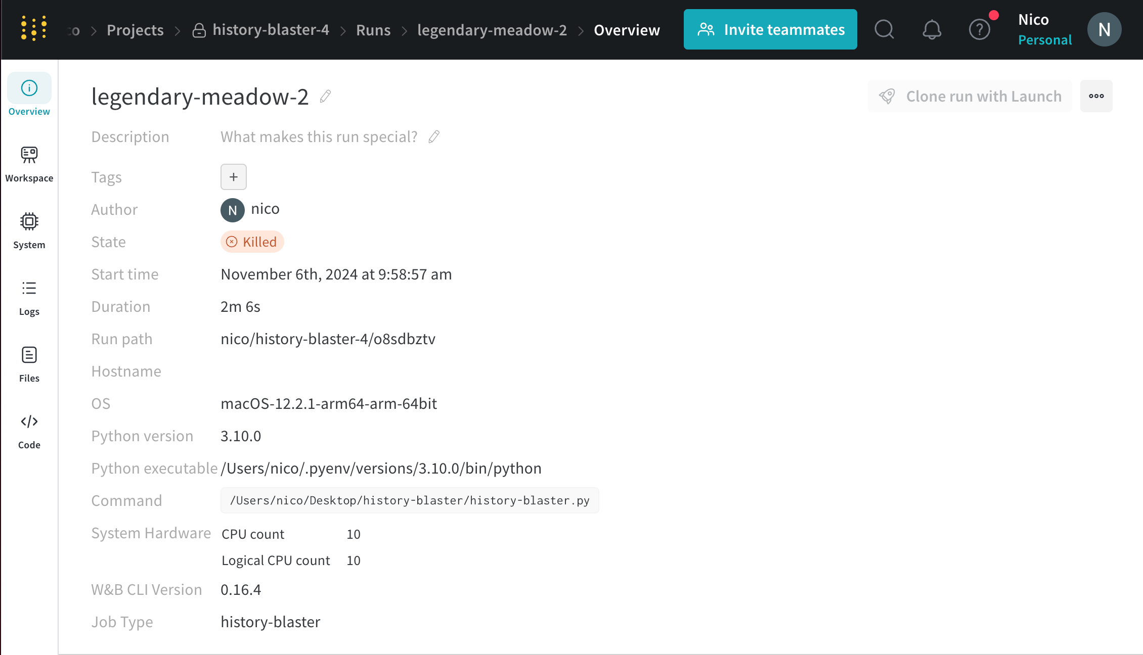 - Host name: W&B が run を計算する場所。ローカルマシンで run を初期化した場合、マシンの名前が表示されます。