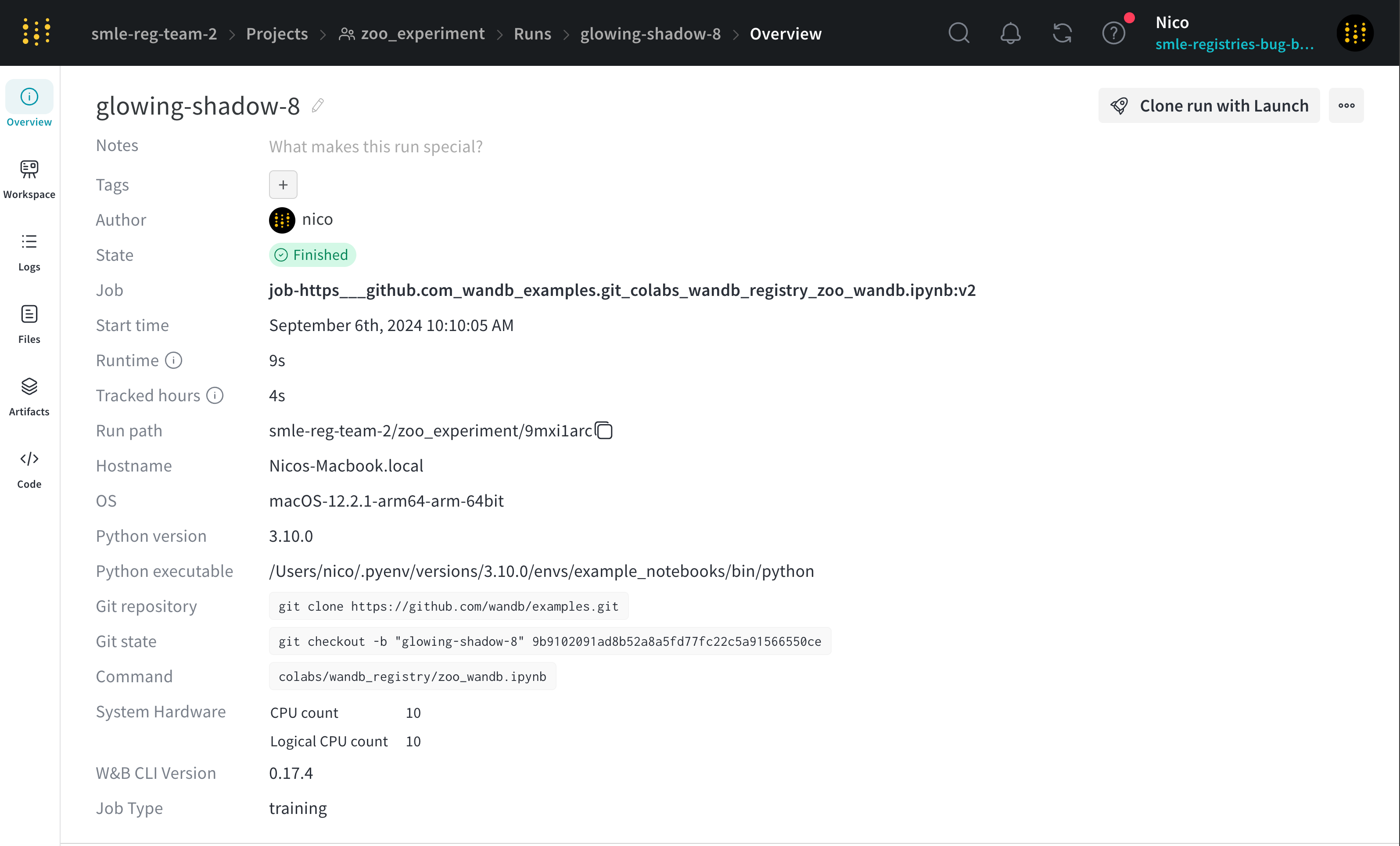 run の状態、run にログ記録されたアーティファクト、run 中に記録されたログファイルなど、特定の run に関する情報を表示します。