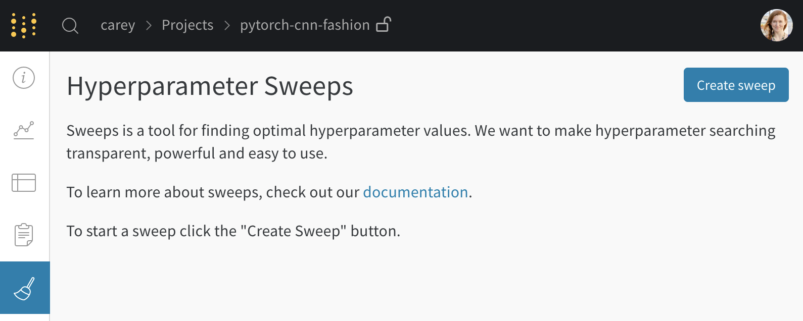 프로젝트 페이지에서 사이드바의 Sweep tab을 열고 Create Sweep을 선택합니다.